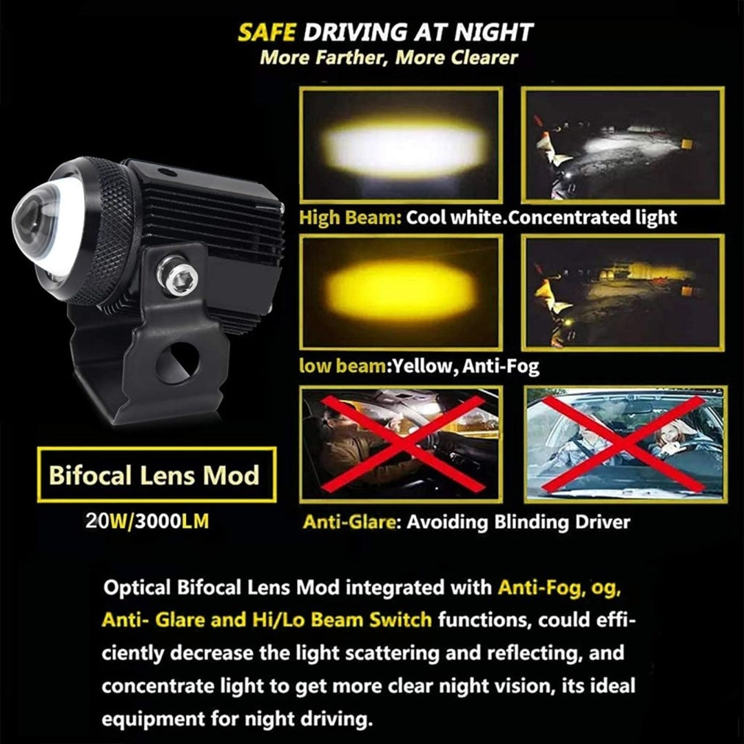 Dual Color Motorcycle Led Fog Lights】HJG Mini Driving Lights Low beam 3000K Amber Yellow & high beam 6500K White, can be fog lights, DRL, Driving Light.