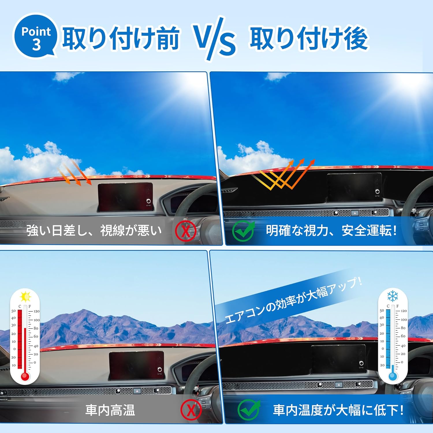 Advanced Thermal Shield: Acts as a powerful insulator against the sun’s heat, keeping your cabin cooler and protecting sensitive dashboard electronics from overheating and UV-induced cracking.